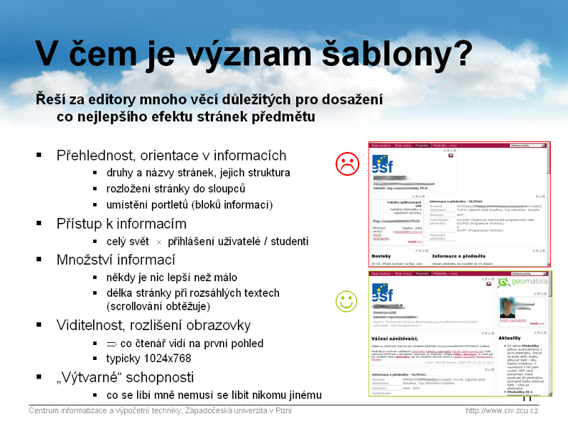 - další funkce, které na běžných www stránkách nejsou k dispozici, nebo se obtížně realizují (diskuse, elektronické odevzdávání semestrálních prací,...).
